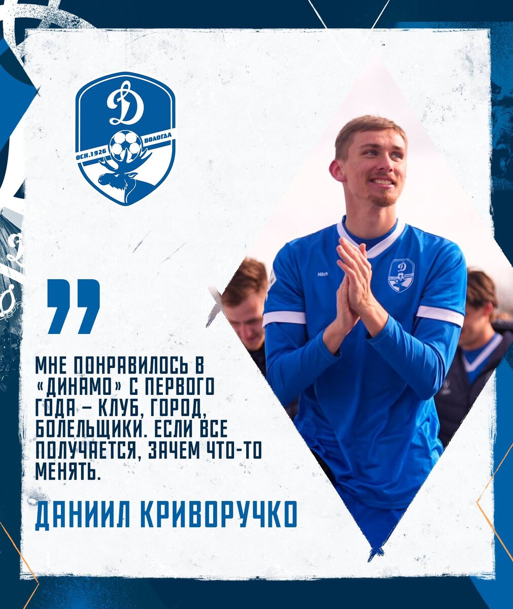 : — Я очень счастлив, что и дальше буду защищать цвета «Динамо». Хочу поблагодарить руководство клуба и тренерский штаб, которые хотели, чтобы я остался. Это самое главное. Мне понравилось в «Динамо» с первого года – клуб, город, болельщики. Если все получается, зачем что-то менять. Большой плюс, что за время пока я здесь, клуб и все что рядом с ним постепенно развивается. Отдельное спасибо нашим болельщикам! Их великолепная поддержка нас всегда заряжает и гонит вперёд. Следующий год для «Динамо» юбилейный и очень важный. Мы приложим максимальные усилия для достижения самых высоких целей, очень надеемся на поддержку наших любимых болельщиков и конечно же города! @dynamovologda
