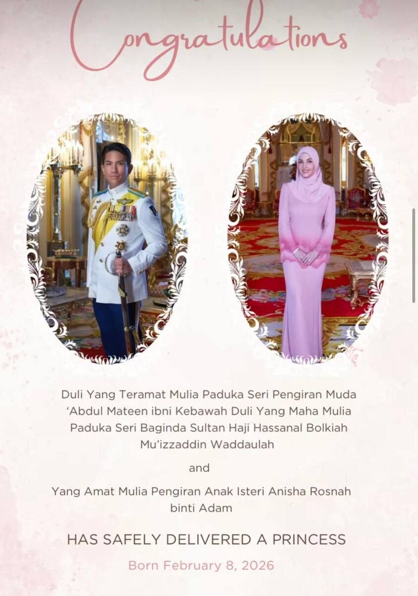 Начнем день с хороших новостей: фан-страница принца Брунея Абдул-Матина и принцессы Аниши сообщила, что у пары родилась дочь. Малышка появилась на свет сегодня. Ждем официального подтверждения от счастливых родителей. 🩷