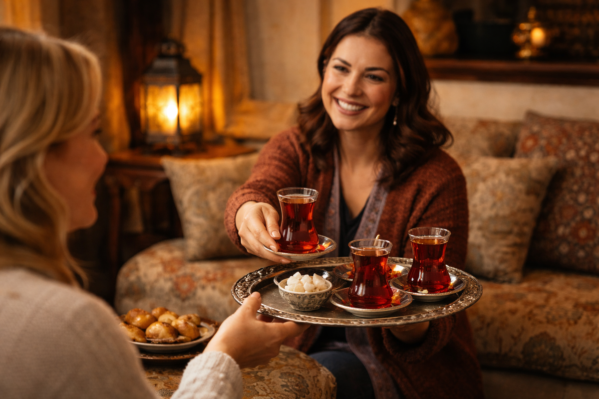 Со мной это случилось в Турции на третий день. Я уже была уверена, что освоилась: улыбаюсь, киваю, говорю “спасибо” правильной интонацией — всё отлично. И тут меня позвали “просто на чай”. “Просто на чай” в Турции — это как “на минутку зайду” в России. То есть вы уже понимаете, что минутка растянется, но всё равно идёте. Потому что интересно. Я захожу, сажусь — и меня встречают так, будто я их любимая племянница, которую давно не видели. И начинается. Сначала чай — красивый маленький стаканчик, поднос, всё как в кино. Я делаю глоток: вкусно. Потом появляется тарелочка сладкого. Я беру одну штучку. Думаю: “Отлично. Я взрослая. Я контролирую ситуацию.” Через минуту мне подсовывают вторую тарелочку.