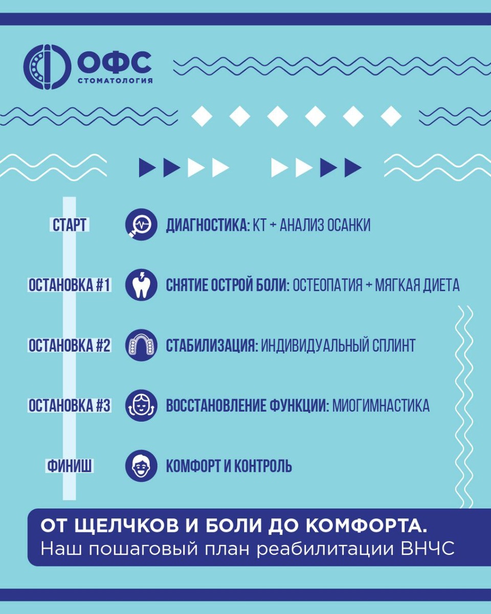». Наш пошаговый план реабилитации ВНЧС. Давайте сегодня отправимся в путешествие, где конечной остановкой станут расслабленные мышцы и отсутствие боли в суставе. 🏕Любую поездку нужно спланировать, чтобы получить предсказуемый результат. Так и мы не начинаем лечение без полной диагностики. Пост про диагностику https://dzen.ru/media/ofs/mojno-li-vyrovniat-zuby-bez-diagnostiki-vnchs-esli-sustav-ne-bespokoit-69845d249a9491386c2c6bdd 🚗 А вот и 1-я остановка! Прежде чем перестраивать привычные механизмы жевания и депрограммировать мышцы, следует снять боль. Иногда одной миогимнастики недостаточно, поэтому на помощь приходит остеопат. 🚧 Следующая стоянка – изготовление и выдача сплинта. Это специальная прозрачная капа, которая располагается на зубах нижней челюсти и играет ключевую роль в нормализации положения сустава и функции жевания. ⛽️ Наша постоянная "заправочная станция" – миогимнастика. Упражнения на расслабление мышц необходимы нам в течение всего "путешествия". Чем больше