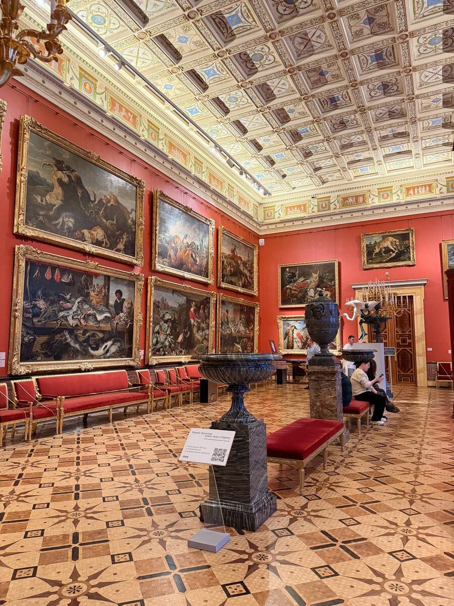 Лавки Снейдерса. Это зал, который многие зрители стараются пройти побыстрее. Слишком яркий, слишком плотный, слишком… натуральный. На стенах - знаменитые лавки Франса Снейдерса: сцены из лавок дичи, рыбных, фруктовых и зеленых рядов. Когда-то они восхищали изобилием и мастерством, теперь часто вызывают отвращение. Все эти тушки, потроха, навалы битой дичи и рыбы - слишком жизненно, слишком телесно. Овощи и фрукты тоже разбросаны достаточно небрежно. 🍑 Но попробуем не морщиться. Закроем глаза и перенесёмся в начало XVII века. Петербурга ещё и в помине нет, а Антверпен - один из богатейших городов Европы. Представьте себя богатой дамой, вошедшей в лавку, где всё дышит роскошью: груши из Италии, апельсины с юга, вишня, которая зреть должна была гораздо позже. Фрукты из разных сезонов и регионов - аллегория избыточности самого миропорядка, победы человеческого желания над естественным временем. 🍇 У Снейдерса всё живёт по своим законам. Мармеладные отблески винограда и персиков -