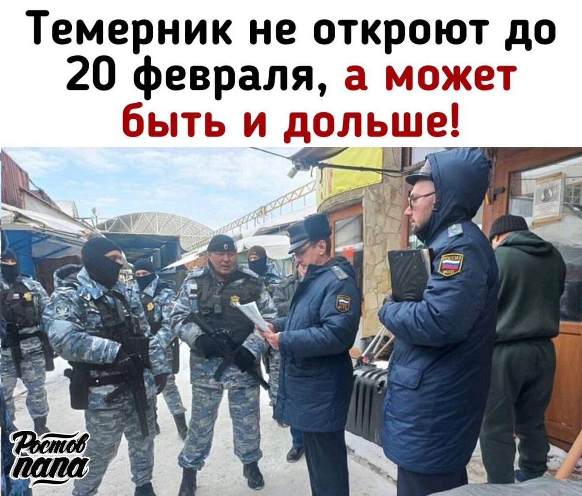 ! — Как минимум до 20 февраля "Первый Темер" и "Белый Темер" будут закрыты. Остальное — без комментариев, — сообщил директор рынка Шамиль Карабашев © Donnews.ру ▪️Шансы, что рынок снова заработает, тают с каждым днём. Губернатор Слюсарь очень жёстко прошёлся по Темернику в день закрытия, 28 января, объявив его рассадником преступности. Повторяется судьба Аксайских рынков, которые закрыли в 2021 году и сейчас хотят застроить их новыми ЖК 👉🏻Новости №1 в Ростове 💌Прислать новость/фото Ростов Папа теперь в Ⓜ️🅰️❌