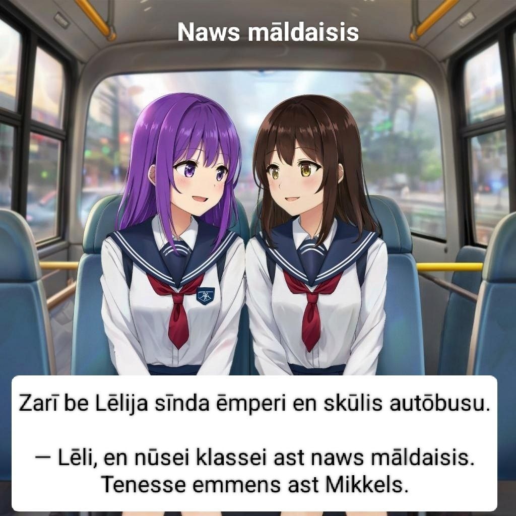 #prūsiskai_kōmiksai@prusiska_bila Naws māldaisis Zarī be Lēlija sīnda ēmperi en skūlis autōbusu. —Lēli, en nūsei klassei ast naws māldaisis.Tenesse emmens ast Mikkels. —Mikkels? —Tāns ast iz Leītawan!Tenesse tāws peisāi lāiskans! —Spārts interessanti! —Tāns bilāi trins billans. —Ō, tāns ast aumenjawīngis. —Aumenjawīngis be aūkts.Be tāns turri grazzjans... —Ha-ha, jā? —Ēmm.Grazzjans kurpins. —Zarī, Mikkels sīnda twāise rīkisnai! —Ka? —Kaīls, Mikkele! —Kaīls, Lēli!Kāigi tebbei ēit? —Mennei ēit labbai, dīnkun! Mikkele, sta ast majā ginni Zarī.Tenesse padīnga twajjas kurpis. —Ō, ēmmm, kaīls, Mikkele. Новый ученик Зари и Лелия сидят вместе в школьном автобусе. —Лели, в нашем классе новый ученик!Его зовут Миккельс. —Миккельс? —Он из Литвы!Его отец пишет книги! —Очень интересно... —Он говорит на трёх языках. —О, он умный. —Умный и высокий.И у него красивые... —Ха-ха, да? —Эммм. Красивые ботинки. —Зари, Миккельс сидит сзади тебя. —Что? —Привет, Миккельс. —Привет, Лели. Как у тебя дела? ⬇️⬇