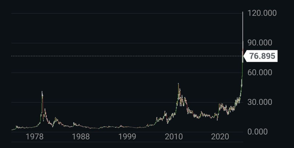 , в VIP чате - расчёты и рекомендации: как заработать на тренде GOLD/SILV и усидеть на высокой волатильности, скрипты краткосрочной для торговли. Открытая 30 января позиция - среднесрочная, пока +30% за неделю Для понимания потенциала прибыли, выложил график цен на серебро за 50 лет. Портфели акций с 30 12 2025г +3% (не смотря на 0 динамику индекса полной доходности Мосбиржи). Планирую ребалансировки по портфелям, в теме "авторская страница" выложил 10 акций, тренды по которым считаю плавно растущими и фундаментал сильным. Сейчас обсуждаем в VIP чате запланированные ребалансировки. Портфели, все сделки и причины принятия решений выкладываю в VIP чате Репутация и доходность ! https://smart-lab.ru/profile/OlegDubinskiy/ Кто ещё не подписался, Подписка через бота https://t.me/OlegTrading_Bot или по QR коду во вложении С уважением, Олег
