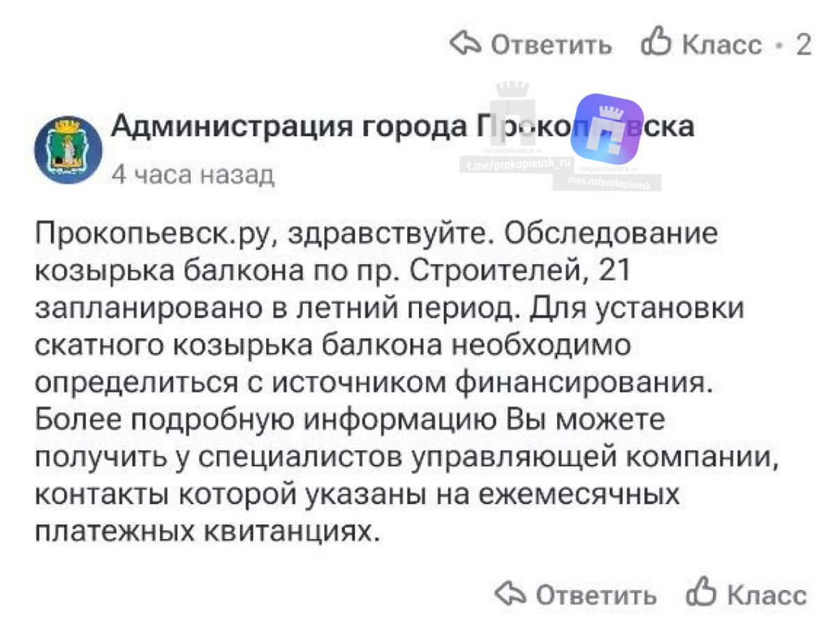 🗣️❓❓❓УК "Развитие" vs Балконный козырек ч.2 Получив формальную отписку от администрации г. Прокопьевска на предыдущий пост, мы решили не ждать когда затопим все балконы ниже нас, и решили устранять последствия БЕЗДЕЙСТВИЯ УК "Развитие", благо была уложена гидроизоляция и мы ещё никого не затопили (хотя если бы затопили, может УК "Развитие" начало бы шевелиться). Проблема в том, что на балконном козырьке не менее 40 см. снега, это более 2 куб.м., или НЕ МЕНЕЕ 200л. ТАЛОЙ ВОДЫ (напомню: УК "Развитие" обещало скидать снег до 01.02.26, но на улице 07.02, а воз, тьфу, снег и ныне там..., и сроки вручения квитанций на оплату, в отличие от сроков уборки снега соблюдаются стабильно), которая неумолимо будет просачиваться через трещины козырька на балкон, козырек будет и далее разрушаться. Итог: администрация г. Прокопьевска бездействует, УК "Развитие"- бездействует. Следующая жалоба на бездействие администрации города и УК в Приемную Губернатора..., ну а там и до Президента недалеко... ПОДП