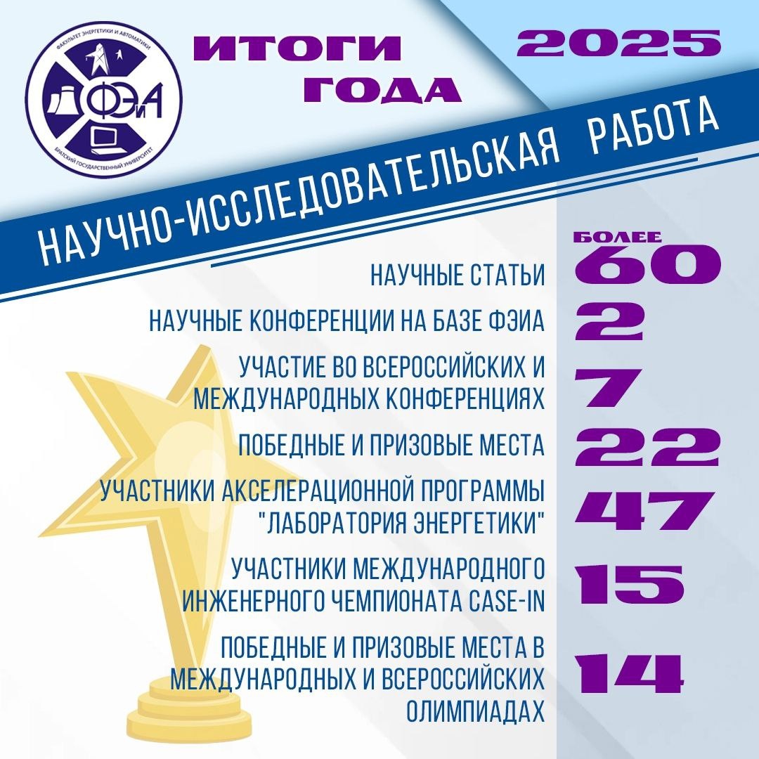 вуза. Здесь формируются инженерные решения, востребованные современной промышленностью и энергетикой. Научные исследования факультета охватывают вопросы электроэнергетики, автоматизации технологических процессов, интеллектуальных систем управления и энергоэффективных технологий. Преподаватели, аспиранты и студенты факультета участвуют в научных проектах, публикуются в ведущих изданиях, внедряют результаты исследований в учебный процесс и реальное производство. В День российской науки выражаем благодарность коллективу факультета за вклад в развитие инженерной науки и подготовку специалистов нового поколения. *В карточках представлены достижения студентов факультета за 2025 год С Днём российской науки!