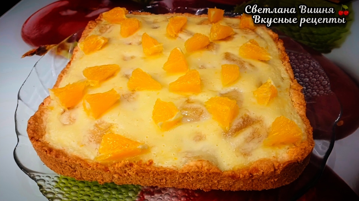 Готовый, еще тёплый пирог украшаем дольками апельсина. В итоге получаем сладкое чудо с ярким банановым ароматом и тающей во рту сметанной заливкой.