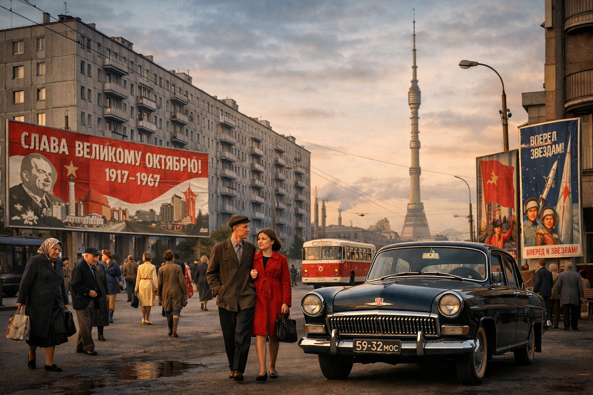 Представьте, что вы выходите на улицу где-нибудь в СССР образца 1967-го, и у вас в голове нет нашего сегодняшнего опыта с доставками, смартфонами и вечной спешкой, зато есть простая задача — пройтись по городу и понять, чем вообще живёт страна. И вот тут начинается самое интересное: 1967-й — это не «ранний СССР» и не «поздний СССР», это такая середина, когда всё вроде бы уже устоялось, но ощущение будущего ещё не выветрилось, и люди реально верят, что дальше будет только лучше.