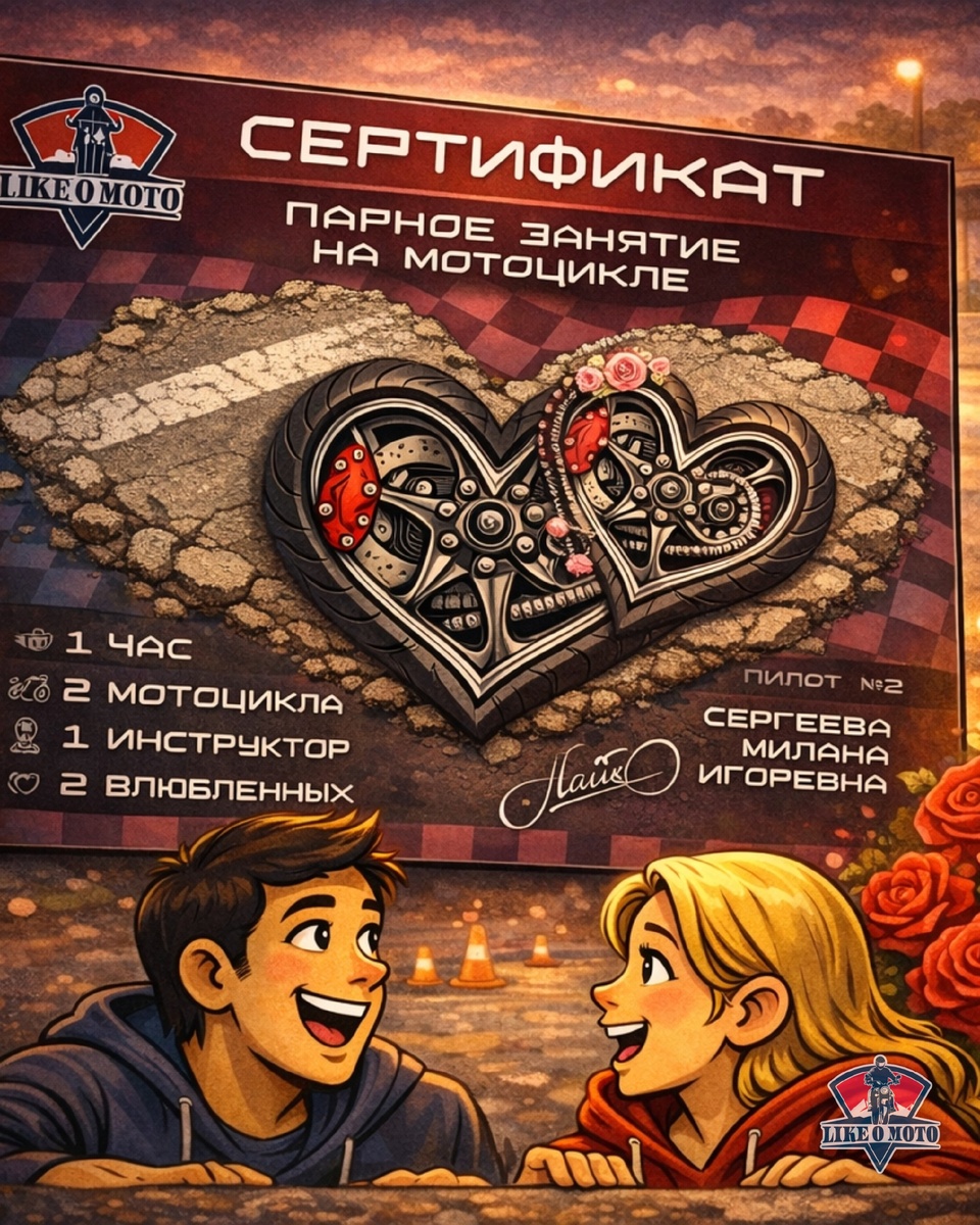 🏍️ Парный сертификат — это одно занятие для двоих, которое вы проходите вместе и одновременно. Идеально для свидания, подарка или «давай попробуем что-то новое». Особенно если хотя бы один из вас новичок — будет весело и запомнится надолго. Как проходит занятие: - Продолжительность: 1 час - Участники: 2 человека одновременно - Один инструктор для вас двоих Структура занятия: 15 минут — инструктаж (понятно и спокойно) 45 минут — практика вождения Даже если вы ни разу не сидели на мотоцикле, это нормально. Мы подстроим темп, объясним на пальцах, поддержим и проконтролируем. 100% эмоции и воспоминания на всю жизнь. Напишите нам — подскажем ближайшие свободные слоты и поможем выбрать удобное время. https://vk.ru/market/product/parny-sertifikat-na-zanyatie-62397586-13964794