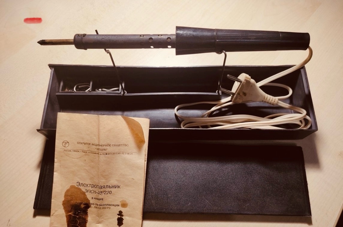 Достал из сумки паяльник. Советский, ЭПСН-40. Вилка прямо на проводе, никаких станций. Включил в розетку. Через минуту поднёс к припою - тот моментально расплавился лужей.