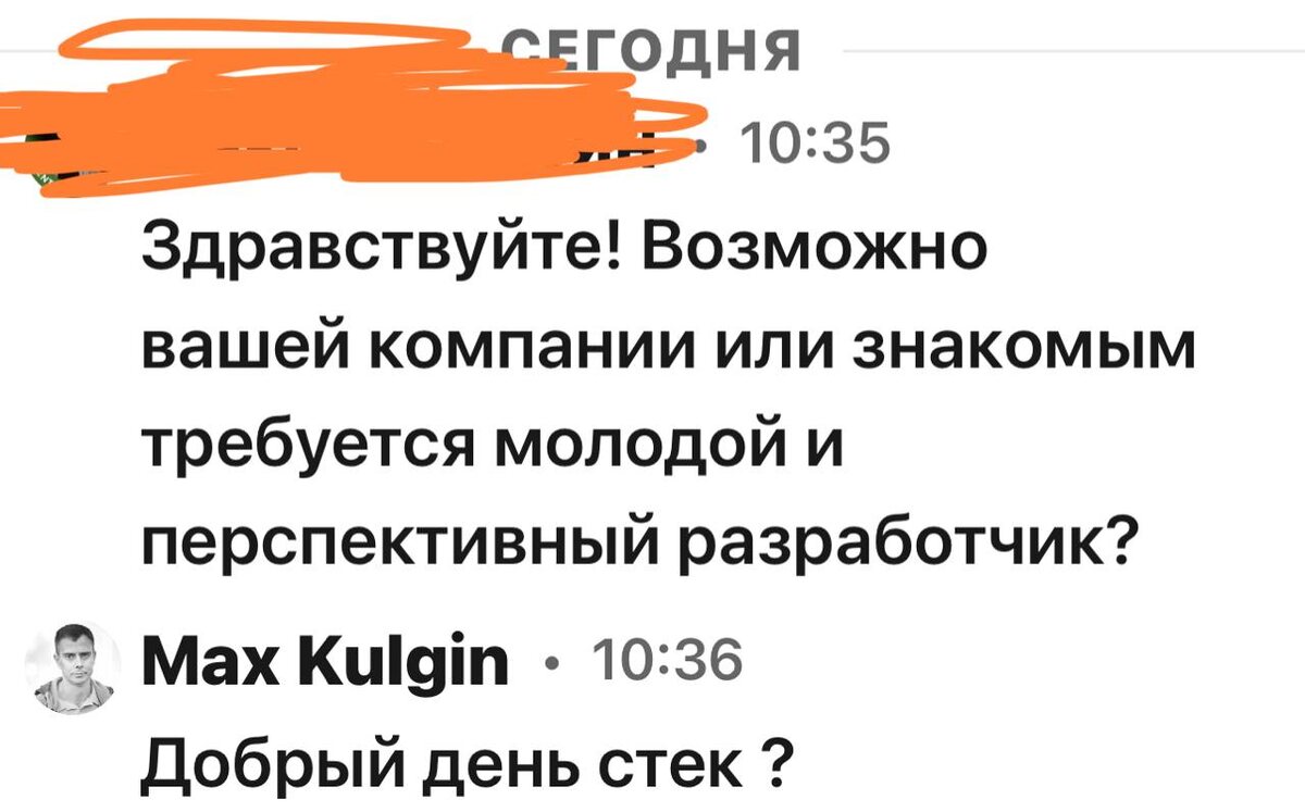 Такое пишут регулярно, часто в личку. Во всех соц.сетях. Умно, ибо через ХХ хрен проберешься. Тут мы не сошлись тем, что человек не в Питере и стек не наш (Питон). Причем мы не ищем, хотя думали, что надо разместить вакансию...