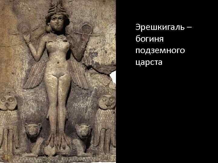Эрешкигаль ("царица темной земли"), в мифологии народов Месопотамии богиня Куры, хозяйка царства мервых, владычица подземного мира и старшая сестра Инанны (или Иштар в ассирийских и вавилонских текстах). В шумерских мифах Эрешкигаль была единственной, кто мог судить и править в своем царстве. Главный храм, посвященный ей, находился в Куте. В более поздних восточно-семитских мифах он управляла Иркаллой вместе со своим мужем Нергалом. В античные времена древние греки и римляне сопоставляли Эрешкигаль с богиней Гекатой. В заголовке одного из заклинаний так называемого «Магического папируса» из библиотеки Мичиганского университета, который датируется концом третьего века нашей эры, Геката упоминается как «Геката Эрешкигаль». Существует миф о шумерских представлениях загробной жизни – "Нисхождение Инанны в ад". Богиня любви Иштар (Инанна) и правительница планеты Венеры была самой популярной богиней в Двуречье. В ее честь строились великолепные храмы, изображения богини постоянно носили во г
