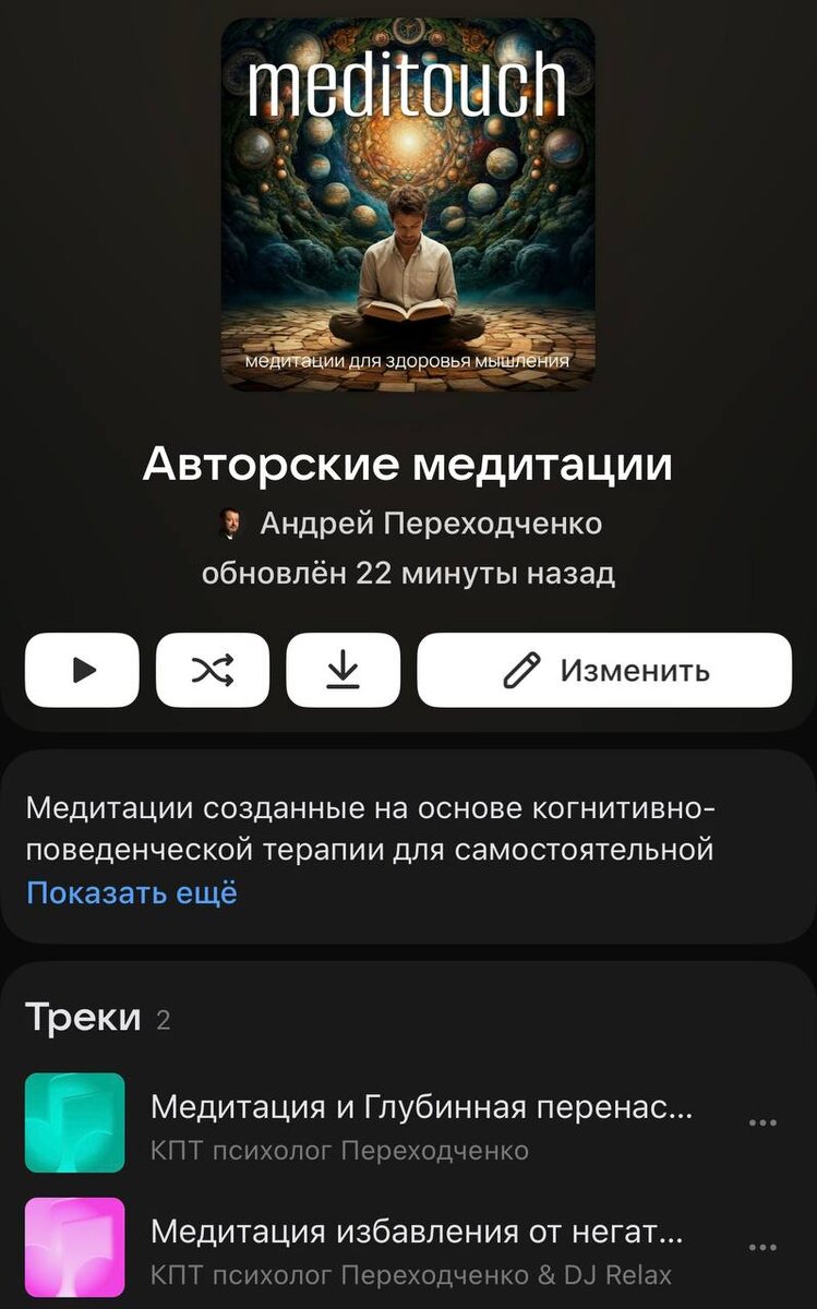 подобных нейромедитаций. Результатом этой работы стали несколько треков, один из которых создан с профессиональной помощью моего друга Александра Рязанова (DJ Relax) Послушать и ощутить действие механизмов, которые заложены в медитациях программирования подсознания можно в ВК 📱 Или здесь в ТГ👇