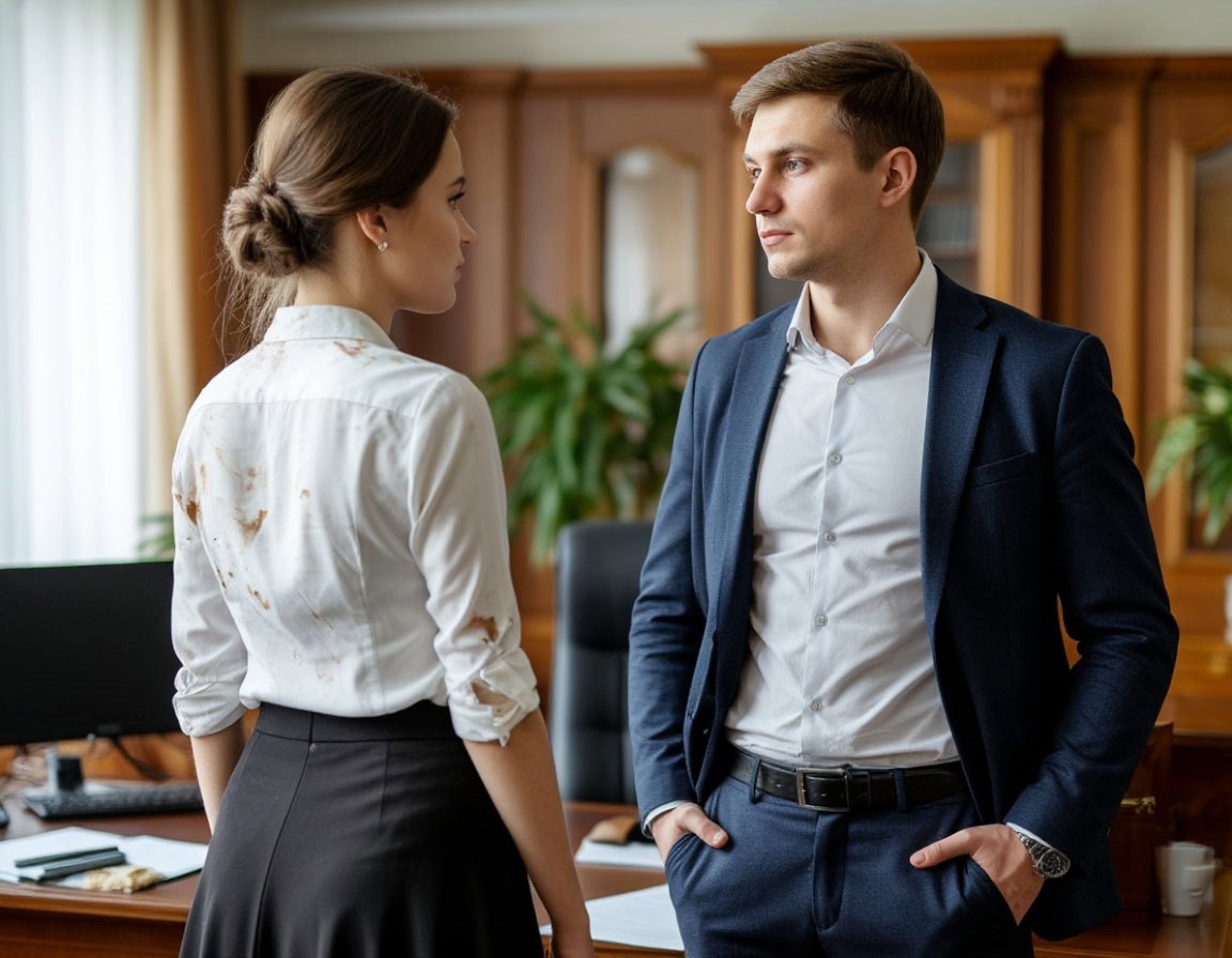 На пороге стояла девушка в порванной юбке, с растрепанными волосами и кофейным пятном на блузке.