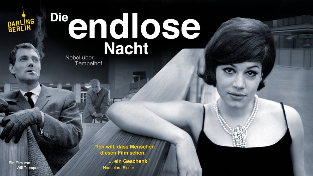 «Бесконечная ночь: Туман над Темпельхофом» (оригинальное название: Die endlose Nacht – Nebel über Tempelhof) — это немецкий чёрно-белый драматический фильм в жанре антологии (ensemble film), снятый режиссёром и сценаристом Виллом Тремпером в 1963 году. Фильм снимался ночью в реальном аэропорту Берлин-Темпельхоф (закрытом после 22:00) в течение 45 съёмочных дней с 18 ноября 1962 по 31 января 1963 года. Премьера состоялась 8 мая 1963 года в берлинском кинотеатре Marmorhaus. Как в описании и написано фильм снимался почти на 100% в аэропорту Берлин-Темпельхоф, который в 2008 году был закрыт. На первых кадрах мы видим навес, под которым проходила посадка и высадка пассажиров. Свежие фотографии были сделаны мной во время «дня открытых дверей» в бывшем аэропорту в 2018 году. Главный зал ожидания. К сожалению, мне так и не удалось отыскать этот «Brunswick Bowling» боулинг-центр. Нигде нет вообще никакой информации. Само название «Brunswick» это американская компания, которая изготавливает авт