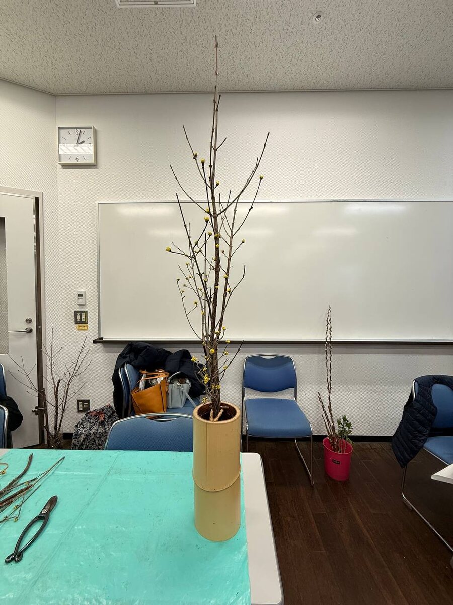 За окном еще кружит февральский снег, а в классе уже вовсю торжествует весна. Сегодня наш открытый урок посвящен классической композиции Сёка из веток Кизила лекарственного (Сансюю). Работа в вазе Дзунда — это всегда вызов. Вместо привычного кензана мы используем Кубари — деревянные рогатки-распорки, как велели древние традиции. Удержать баланс тяжелых веток, уловить их природный изгиб и зафиксировать направление без единой иголки — задача не из легких. Но именно в такие моменты, когда ветка наконец «замирает» в правильном положении, чувствуешь себя настоящим профессионалом, сопричастным к таинству мастеров прошлого. Вокруг — удивительный контраст: у кого-то в вазах полыхают красные вербы и хризантемы, наполняя зал теплом. В моей тетради — свежие записи и зарисовки после утренней лекции. Глядя на них, я поймала себя на мысли, что снова чувствую себя студенткой: тот же азарт, то же желание постичь совершенство. Наверное, в этом и есть секрет икебаны — она дарит нам вечную весну и продле