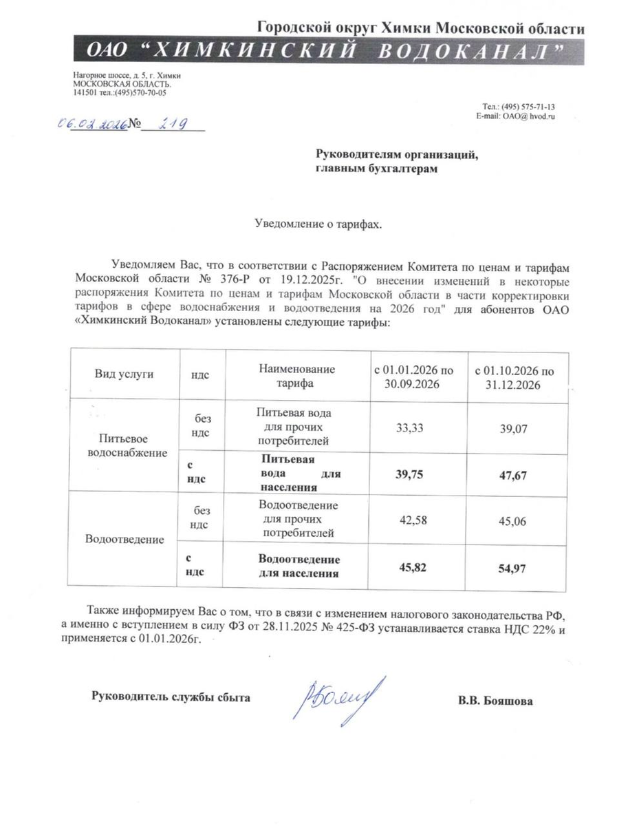 "Химкинский Водоканал" ввел новые тарифы на услуги водоснабжения и водоотведения, распоряжение Комитета по ценам и тарифам Московской области № 376-Р от 19 декабря 2025 года было разослано по управляющим компаниям, которые опубликовали в своих ресурсах. Несмотря на то, что Брёхово обслуживает не эта компания, а "Луневосбытсервис", повышение будет и у нас, так как комитетский приказ — общий.