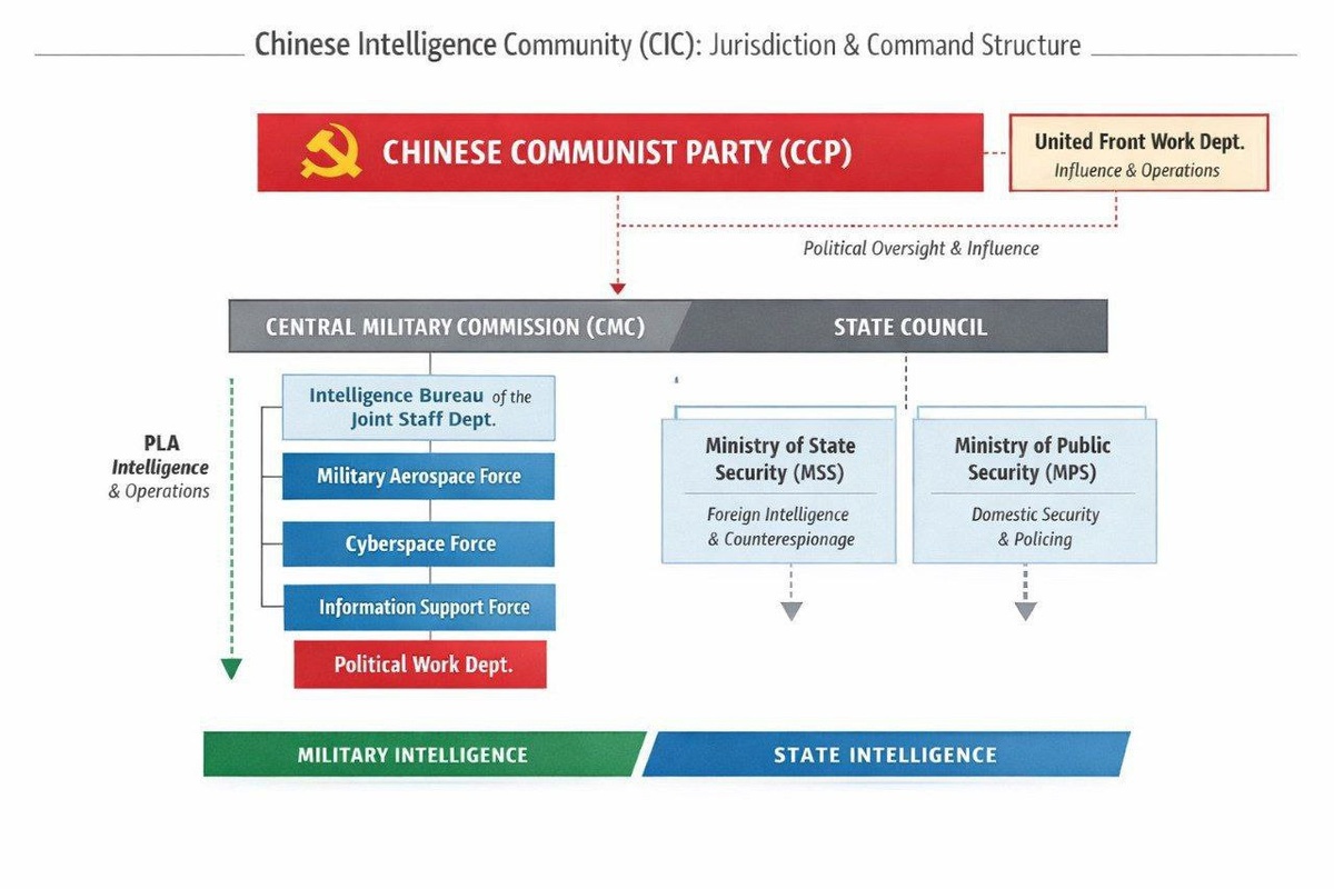 Китайский разведывательный центр (CIC) демонстрирует комплексный подход к защите как внешних, так и внутренних государственных интересов Китая. Однако деятельность CIC выходит далеко за рамки того, что часто принято считать тайными операциями. Ежедневно он координирует действия своих агентов по всему миру, использует высокотехнологичные средства мониторинга в киберпространстве, космосе и традиционной сфере. Он применяет агентов, аналитиков, хакеров и ресурсы – технические, завербованные и внутренние. CIC оказывает огромное влияние. Он генерирует разведывательную информацию, оказывает влияние и интригует. В 2024 году архитектура военной разведки Пекина претерпела очередную волну трансформации. Наиболее заметным событием стало официальное роспуск Сил специальных операций Народно-освободительной армии Китая 19 апреля 2024 года. НОАК перераспределила свои основные космические, кибернетические и информационные функции в отдельные подчиненные Центральной военной полиции подразделения. Военн