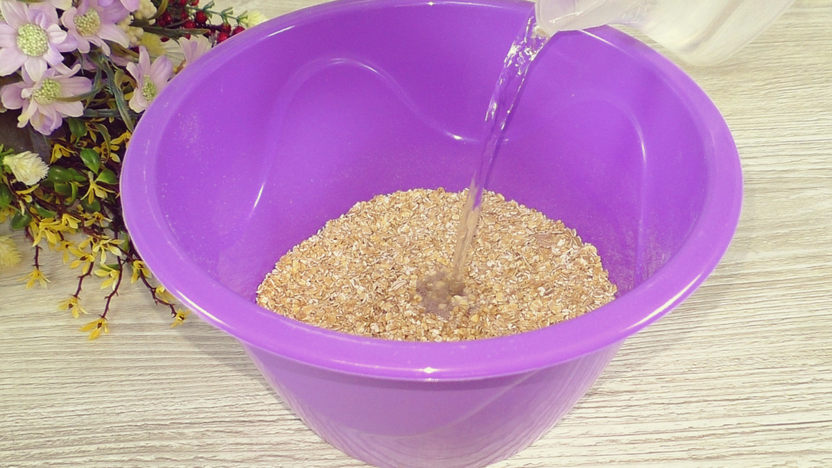 Беру овсяные хлопья (у меня время приготовления 3 минуты) и заливаю их кипятком.