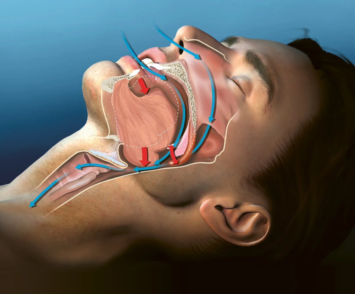 1. Обструктивное апноэ сна (ОАС) – самый распространённый (90% случаев). Дыхательные пути физически перекрываются: мышцы горла и языка расслабляются во сне, ткани смыкаются, и воздух не может пройти в лёгкие. Грудная клетка продолжает двигаться (человек «пытается» дышать), но воздуха нет.