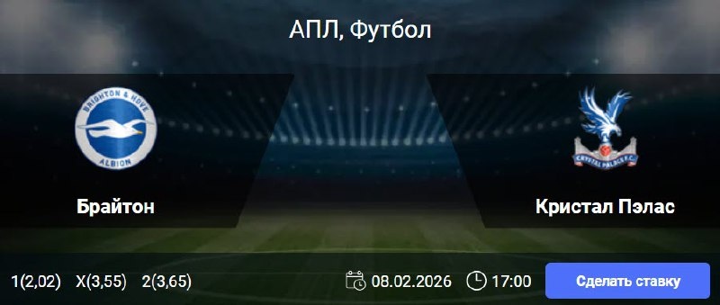 Статистика Брайтона: Ставка «обе забьют» проходила в шести из семи последних поединков клуба в чемпионате. В пяти предыдущих встречах «Брайтона» в АПЛ фиксировалось ровно два или три взятия ворот. В родных стенах команда удерживает пятиматчевую серию без поражений, однако четыре из этих игр завершились вничью. Статистика Кристал Пэлас: В пяти из семи последних игр чемпионата с участием «Кристал Пэлас» забивалось не более двух мячей. На выезде лондонцы не могут победить в четырех турах кряду (одна ничья и три поражения). Во вторых таймах семи предыдущих встреч «орлы» сумели отличиться лишь однажды. 🎯 ТМ (2,5) 🎲 кф (2,0) 👉 СДЕЛАТЬ СТАВКУ 🎁 ФРИБЕТ WINLINE - 3000₽ (промокод: BETWIN) 👉 СМОТРЕТЬ ПРОГНОЗ