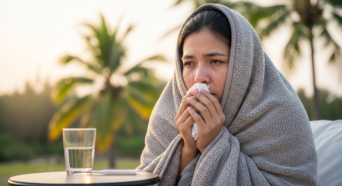 Таиланд у многих ассоциируется с солнцем, морем и вечным летом, но простуда здесь случается не реже, чем в холодных странах. Кондиционеры на максимум, резкие перепады температуры между улицей и помещениями, ночные автобусы, мокрая одежда после тропического ливня и ослабленный перелётом иммунитет — всё это создаёт идеальные условия для насморка, боли в горле и температуры.