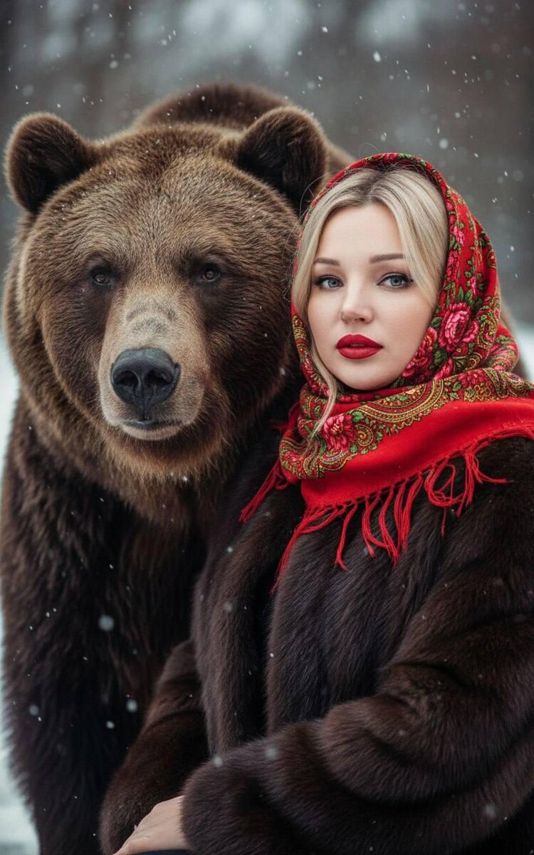 Промт - медведь и девушка Модель: Nano Banana Сгенерировать🪄 Гиперреалистичное лицо. Создай Крупным планом ровно по центру, создай меня и медведя большого, бурого. Я и медведь смотрим ровно в камеру в объектив. Стиль -волосы у меня длинные . Макияж - красные губы под цвет платка , на глазах прорисованы стрелки черные. На мне надета роскошная, дорогая, изящная меховая шуба из баргузинского соболя. Моя голова покрыта красным платком, (павлопосадским платком) который обрамляет лицо. Задний план размыт (боке), видно, как падают мягкие снежинки. Съемка в профиль или три четверти. Высокий контраст, глубокие тени, кинематографический кадр, ультрадетализация, студийное качество, Не изменяй черты Лица tDqUSUsv7PSGW1VWz2HVXf
