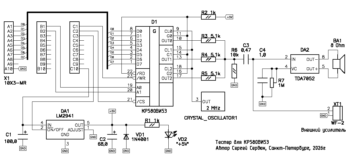 Всех приветствую! Среди микросхем серии 580 есть микросхема трёхканального таймера счётчика, который используют, в основном, для тактирования микросхемы последовательной приёмо-передачи данных КР580ВВ51 - это КР580ВИ53. Для этого используют один из её каналов. КР580ВИ53 сравнительно гибкая в настройке. Но функции КР580ВИ53 этим не ограничиваются. У неё несколько режимов работы и перенастраивать микросхему можно в любой момент времени. Также, каждый канал можно настраивать независимо от других двух и каждый канал будет выдавать свою тактовую частоту. Минимальная выходная частота - 30Гц. Максимальная 2МГц при условии тактирования 2МГц. Выходная частота получается при записи в управляющий регистр опредённого коэффициента. Коэффициент расчитывается по формуле: K = 2 000 000/желаемая_частота_в_герцах. Используя динамически меняющуюся частоту на выходе можно получить простой трёхголосый синтезатор. На основе этого и был собран данный тестер. Схема представлена ниже: КР580ВИ53 подключается