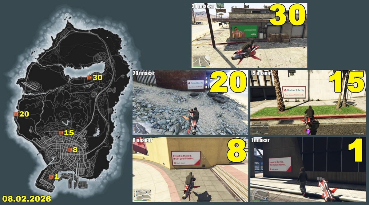 ) ❄ За порчу одного плаката платят 15.000$. Если закрасить все 5 плакатов в день, бонусом получите ещё 25.000$. Итого 100.000$ ежедневно. Закрасьте 5 плакатов и получите уникальный костюм "Уличный художник". Плакаты меняются раз в сутки в 9.00 МСК. Видео гайд: https://www.youtube.com/watch?v=sPQDYKq1d5M