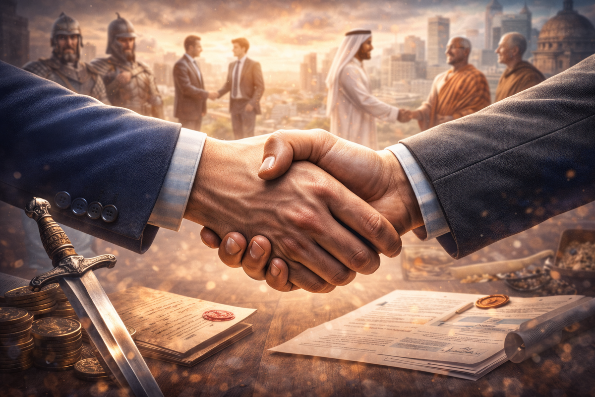 Рукопожатие кажется такой очевидной вещью, будто оно существовало всегда. Два человека встречаются, протягивают руки, короткое движение — и разговор начинается легче. Но если задуматься, это довольно странный ритуал: вы приближаетесь к незнакомцу, касаетесь его, задерживаетесь на секунду и только потом говорите. Почему именно так, кто это придумал и как жест стал почти универсальным? Самый важный вопрос: что рукопожатие должно было показать другому человеку? В основе — сигнал безопасности. Открытая правая рука означает, что в ней нет оружия. Ещё сильнее работает идея взаимного ограничения: пока вы держите чью-то руку, вам сложнее ударить этой же рукой или внезапно выхватить что-то. Отсюда и простое объяснение, почему чаще используется именно правая: она у большинства людей ведущая и потенциально более опасная. Показать её открытой — значит сделать шаг навстречу. В некоторых культурах и в разные эпохи приветствие могло быть более «проверочным»: не только ладонь, но и запястье или пред
