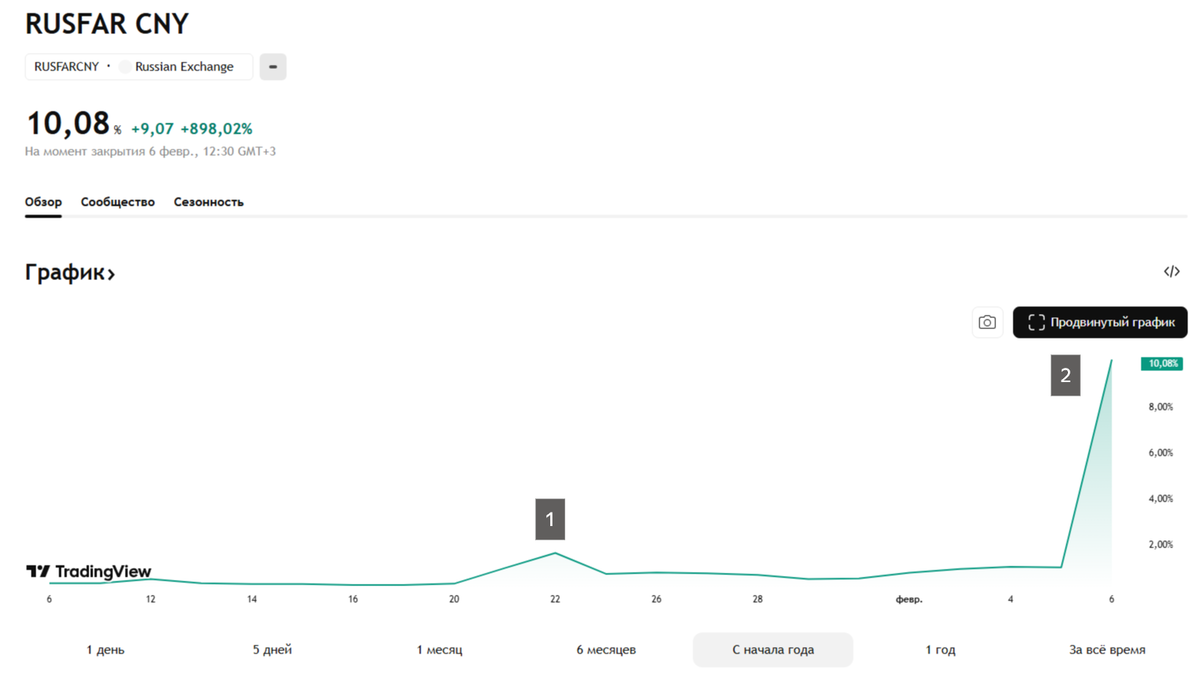 Пару недель назад я писал, что впервые более чем за год начала расти ставка юаневой ликвидности RUSFARCNY, и писал там, что нужно некоторое время, чтобы понаблюдать: это был случайный скачок или начало тренда. И вот, если в тот момент указанная ставка поднималась только до 1,68%, что все равно было сильно выше, чем весь предыдущий год, то в последние дни она подскочила еще на порядок выше - аж до 10+%, ну а в районе 1% (повышенные значения) находилась до этого несколько дней подряд. Обозначил на графике первый, описанный ранее скачок, и нынешний, разница видна невооруженным глазом. Более того, скачок будет очевиден, даже если взять график за последний год! Ставка RUSFARCNY - это ориентир, по которому банки занимают юани друг у друга или у Центробанка через операции репо (на ночь или несколько дней под залог ценных бумаг). Она, как и любая денежная ставка, зависит от спроса и предложения: растет, когда наблюдается дефицит юаневой ликвидности и падает, когда наблюдается ее профицит. Фунд