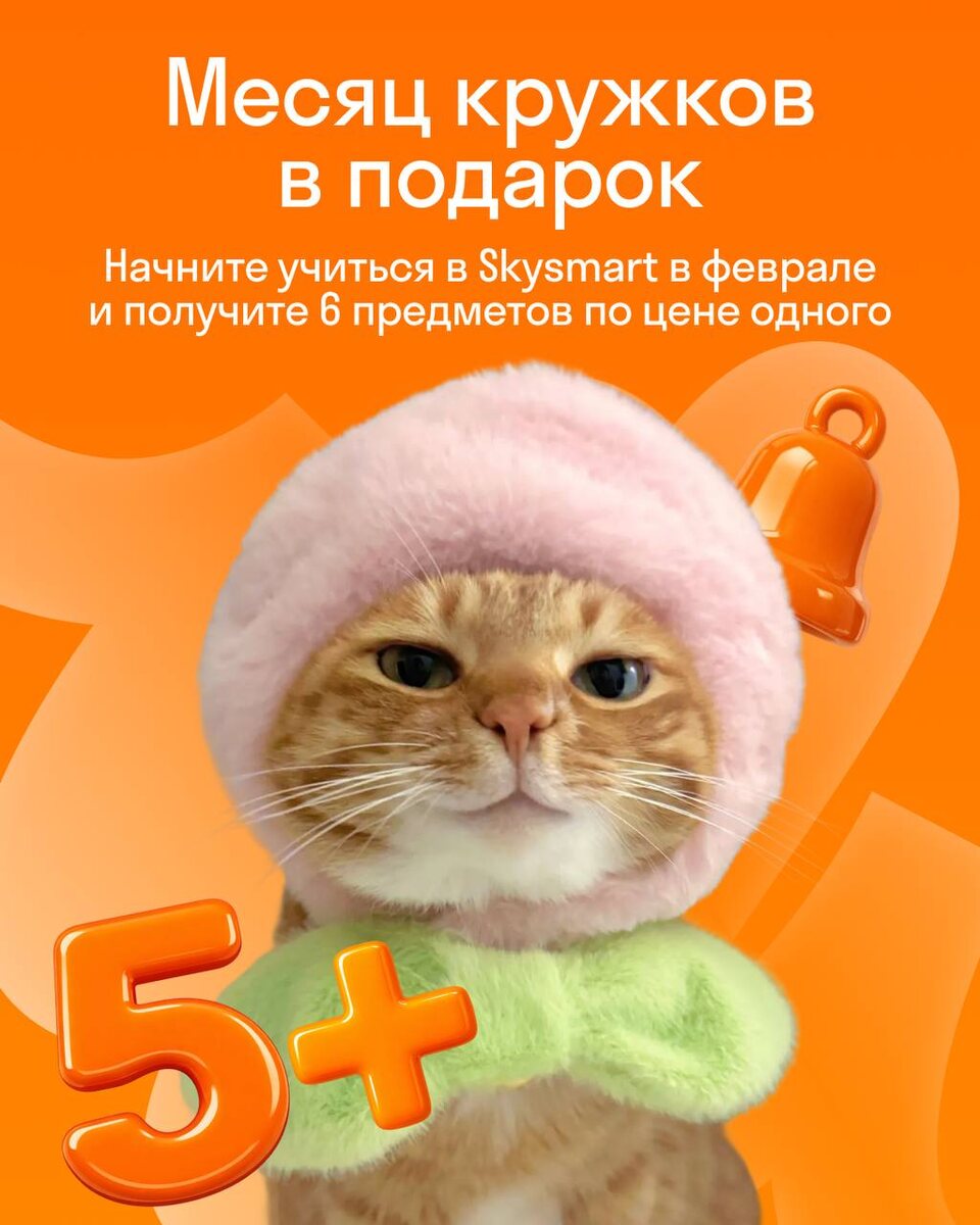 ! Начните учиться в Skysmart в феврале и получите 6 предметов по цене одного. По промокоду ПРАКТИКА ребёнок целый месяц сможет бесплатно посещать онлайн-кружки: 🇬🇧 английский язык; 🔢 математика; ✍️ русский язык; ⚙️ физика; 🧩 дошкольная подготовка; 💻 программирование. Акция действует по 28 февраля!