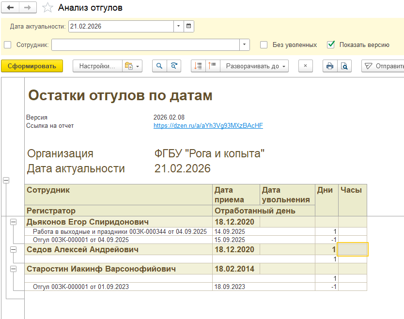 Начиная с ЗУП релиза 3.1.30.225 (дата выхода релиза: 26.06.2025) появился подневной учет дней отгулов. Согласно ст. 153 ТК РФ: День отдыха, указанный в части четвертой настоящей статьи, по желанию работника может быть использован в течение одного года со дня работы в выходной или нерабочий праздничный день либо присоединен к отпуску, предоставляемому в указанный период. Т. е. нужно понимать, за какой день предоставлен отгул, чтобы правильно определить срок. В письме Минтруда от 21.02.2025 г. № 14-6/ООГ-804 сказано: Согласно части пятой статьи 153 ТК РФ в редакции Федерального закона от 30.09.2024 N 339-ФЗ (далее - Федеральный закон N 339-ФЗ) день отдыха за работу в выходной или нерабочий праздничный день по желанию работника может быть использован в течение одного года со дня работы в выходной или нерабочий праздничный день либо присоединен к отпуску, предоставленному в указанный период. Таким образом, требуется учет отгулов, зарегистрированных с 1 марта 2025 года. В ЗУП по отгула пока