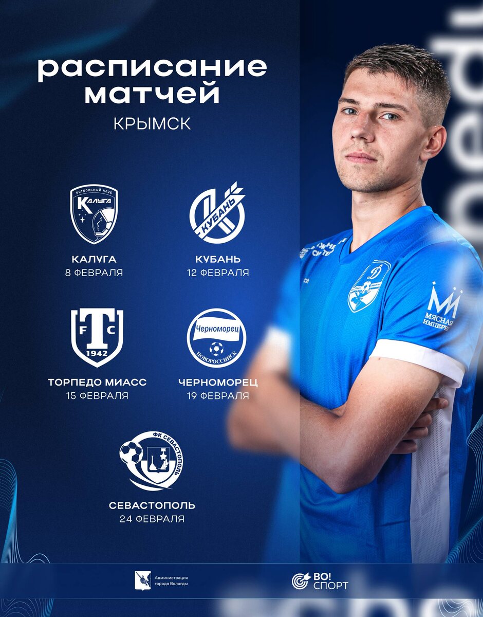 В Крымске динамовцы встретятся с «Калугой», краснодарской «Кубанью», «Торпедо» из Миасса, новороссийским «Черноморцем» и «Севастополем». Подробности о времени и трансляциях контрольных матчей будут предоставлены позже 🔜 @dynamovologda