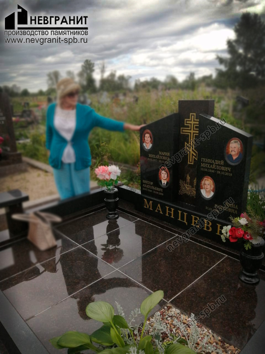 На фоне спокойного пейзажа кладбища, где зелень травы и шепот листвы создают атмосферу умиротворения, возвышается мемориальный комплекс, посвященный семье Манцевых. Этот памятник – не просто надгробие, а тщательно продуманное произведение мемориального искусства, призванное увековечить память о близких и стать местом светлой скорби и воспоминаний. Материалы и Дизайн: Памятник выполнен из двух видов высококачественного гранита, что придает ему особую глубину и благородство. Основная часть, включая стелы и частично основание, изготовлена из глубокого черного гранита – символа строгости и вечной скорби. Дополнительные элементы и облицовка выполнены из красивого коричнево-красного гранита, который добавляет композиции теплоты и изысканности, создавая гармоничный контраст. Центральная композиция состоит из двух вертикальных стел, установленных под небольшим углом друг к другу. Такой дизайн создает эффект раскрытой книги или объятия, символизируя открытость душ усопших, их единство и нераз