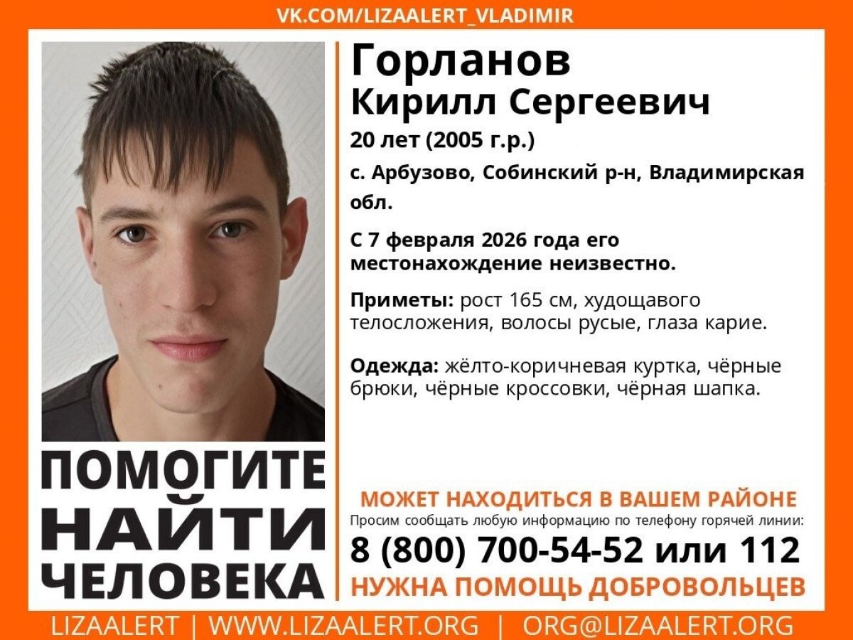 В субботу в селе Арбузово Собинского района пропал юноша, сообщают волонтеры владимирского отряда «ЛизаАлерт». Пропавшему Кириллу Горланову 20 лет. Он худощавого телосложения и невысокого роста. У него русые волосы и карие глаза. В день исчезновения молодой человек был одет в жёлто-коричневую куртку, чёрные брюки, чёрные кроссовки и чёрную шапку.