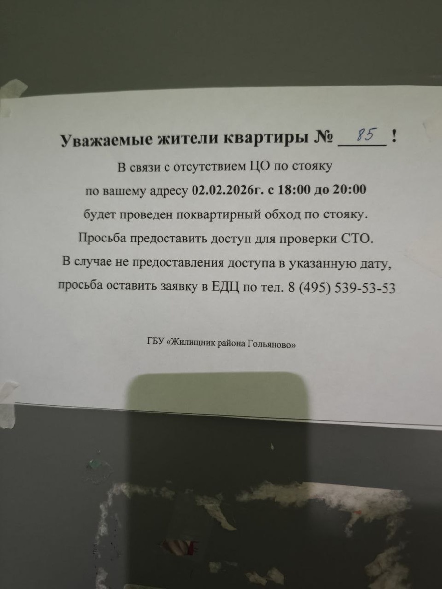 В доме по адресу Щелковское шоссе, 89/2 уже неделю отсутствует отопление по одному из стояков! Неделю зимой в комнате ледник! На заявки прислать сантехника в квартиру через ЕПД и мос. ру реакции ноль. Лично мной 4 заявки отправлены были. Ни один сантехник так и не появился. В будние дни я работаю, но в заявке просила диспетчера указать, что могу подождать прихода сантехника утром до 10:30. Вчера в субботу ждала сантехника с 14 до 20:00. Никого!!! В будни я работаю. Отпрашиваться с работы в будни не имею возможности, где гарантия, что я отпрошусь, потеряю деньги, а сантехник таки появится и не "прокатит" меня. Примите меры. ✦Автор: Аноним Делись новостями тоже 👉 Прислать