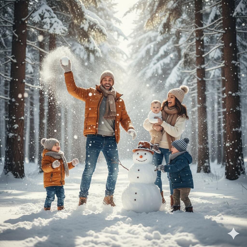 Модель: Nano Banana Сгенерировать🪄 Сохраните оригинальные лица, характеристики лица, волосы, тип телосложения с референсных фото в точности. Изменяйте только окружение зимнего леса. Семья в заснеженном лесу, все тепло одеты в зимнюю одежду. Снег падает вокруг, создавая волшебную атмосферу. Румяные щёки, счастливые улыбки, игра в снежки. Яркий зимний свет, контраст белого снега и тёмных деревьев. Кинематографическое освещение, ощущение зимней сказки. Согласованность лиц, сохранение внешности с входных изображений.