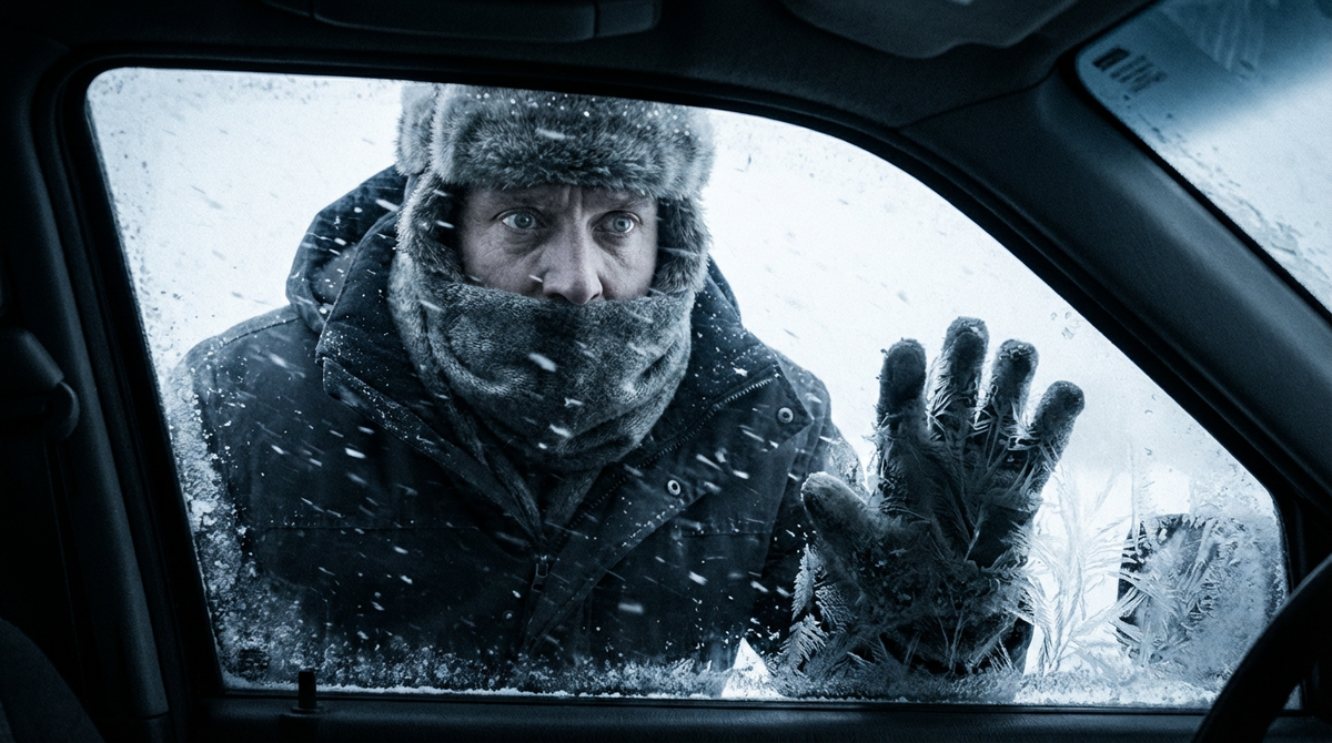 В первую секунду я не поняла, что вижу. Тёмная фигура на фоне белой мглы. Лицо закрыто шарфом, только глаза. Рука в рукавице снова стукнула по стеклу.