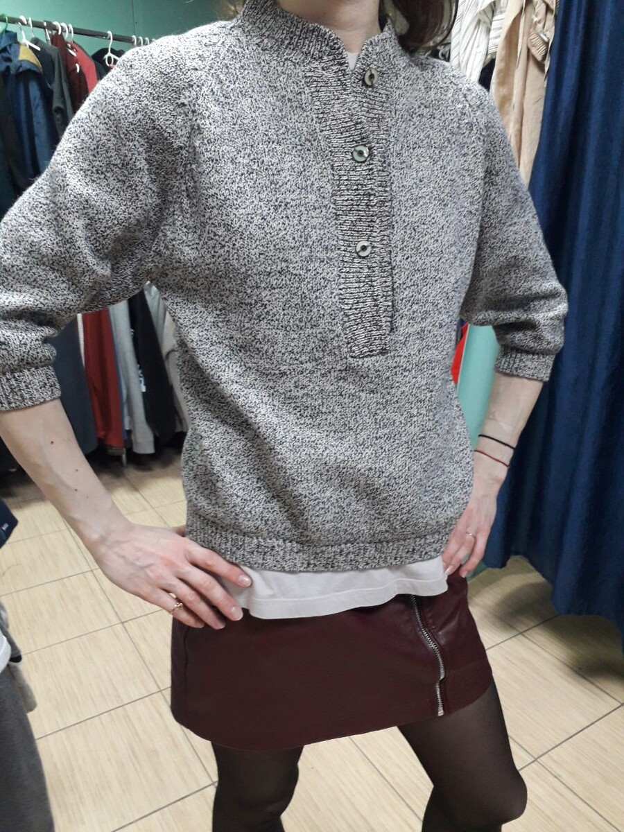 Всем привет . Сегодня собрала для вас подборку одежды в секонд хенде , которую выбрала моя подруга. В сегодняшней статье она и будет моделью , подруга примерила вещи , которые выбрала сама. Но перед тем как показать вам интересные вещички из секонд хенда , хочу сказать вам , мои дорогие подписчики - Спасибо! Вас уже 200 человек на моем канале , спасибо большое , что вы меня читаете. Цена дня сегодня в секонд хенде -1 300 рублей. Теплый , серый свитер с рукавами три четверти , пуговичками на воротнике . Бренд-неизвестен , как и размер(размер одежды моей подруги- S).Материал - приятный на ощупь , теплый.Стоимость вышла - 449 рублей. Решили посмотреть варианты свитерков в мужском отделе : вот такой серый свитшот от Boohoo MAN - бренд мужской одежды, основанный в 2016 году как дочерняя компания Boohoo Group. Размер- М , производство - Китай. Качество-отличное , материал приятный на ощупь . Такой свитшот можно взять на подарок своему другу или купить его для себя. А что - в мужских о