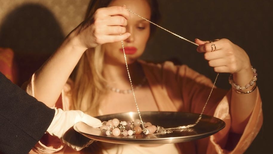 При наличии животика особенно важно, где заканчивается украшение. Лучший выбор — короткие цепочки, кулоны на уровне ключиц, чокеры и многослойные колье, которые формируют акцент в верхней части тела.