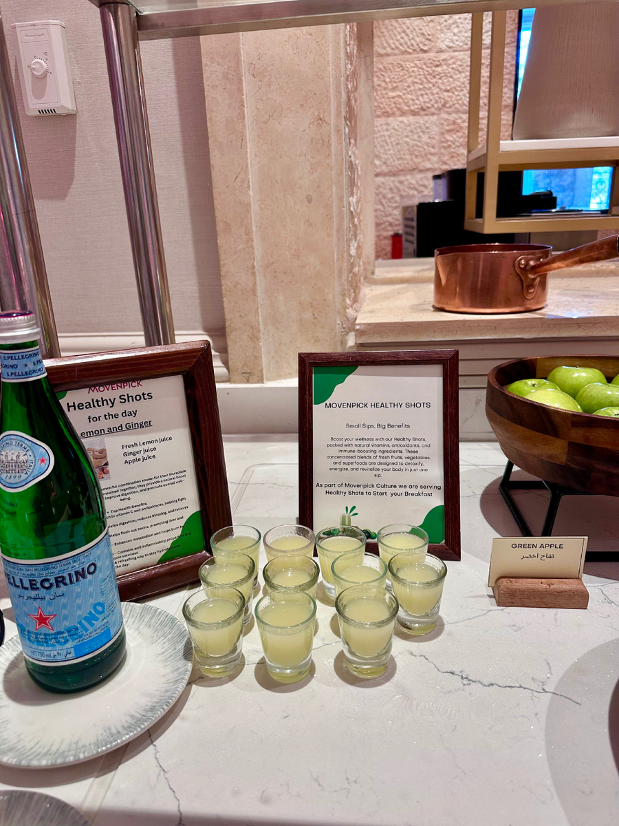 С утра проснулись и пошли на завтрак. Взяли по стаканчику шота в нем имбирь, мед и сок огурца и шпината.