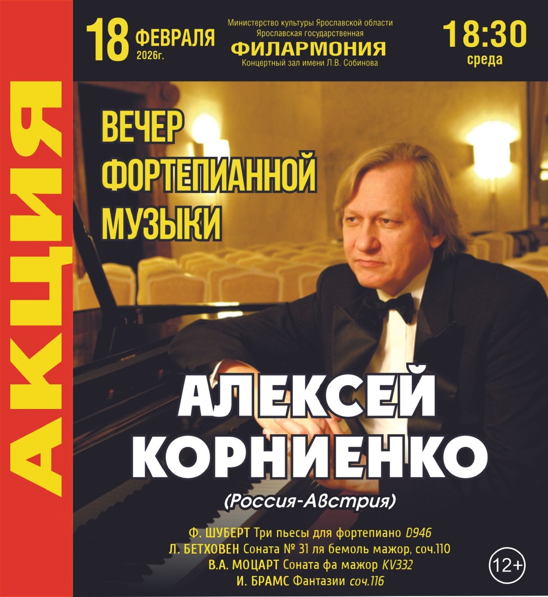 %! 👀 🎹 18 февраля в 18:30 время замрёт, уступая место вечности. Прозвучат шедевры Шуберта, Бетховена, Моцарта и Брамса — путешествие от венской классики до вершин романтизма. За роялем - блестящий пианист Алексей Корниенко (Россия-Австрия). 🌐 https://clck.ru/3RgVxQ Проведите зимний вечер в компании великих композиторов и виртуозного исполнения.