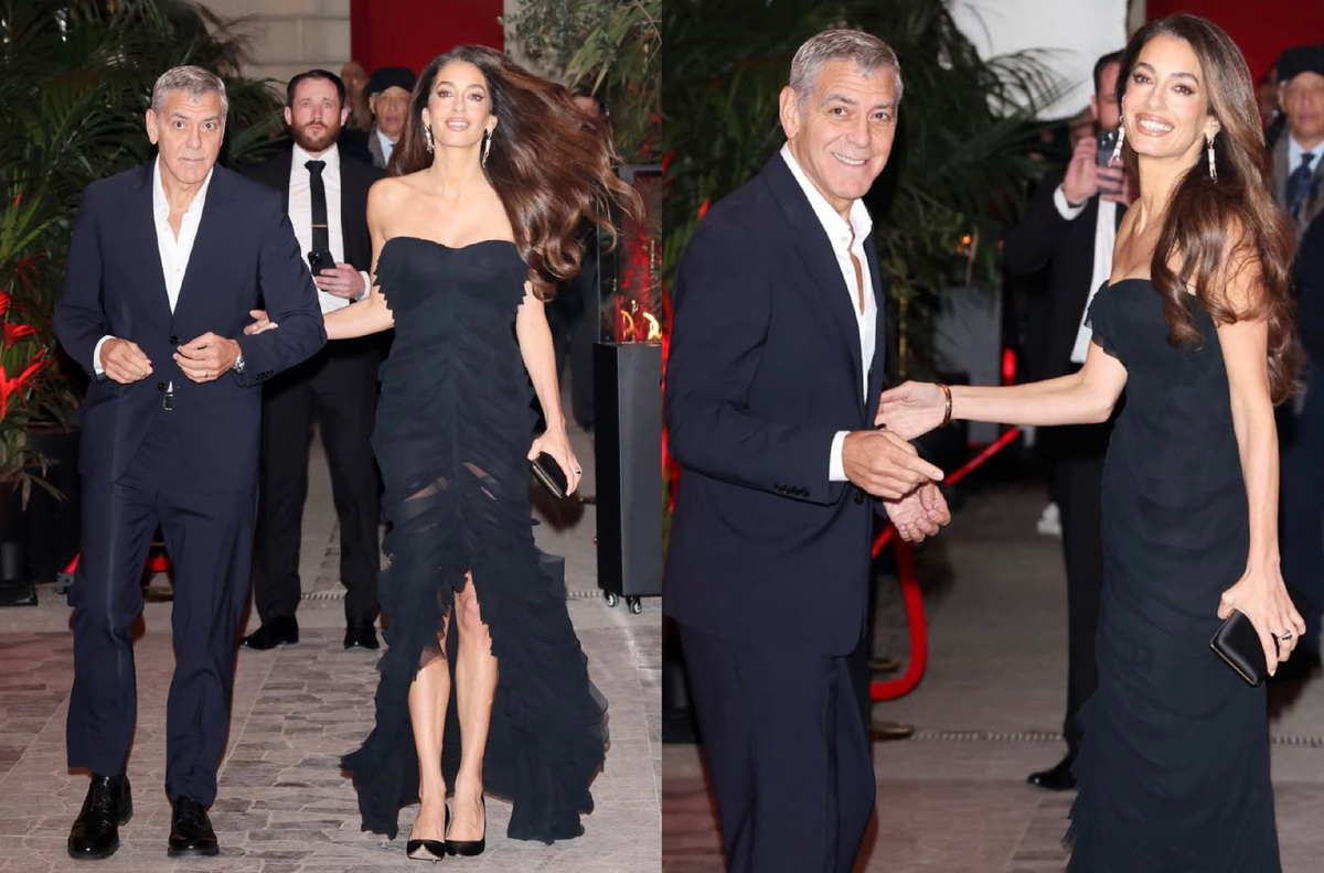 Вчера мы любовались Амаль на выходе из аэропорта. Она шла по летной полосе в total образе от Versace: сумка Medusa, леопардовые сапоги, черная мини-юбка и элегантный плащ. Этот образ был дерзким, но совершенно идеально сбалансированным. Сегодня вечером на ужине Omega House Амаль снова заставила всех затаить дыхание. Она появилась в черном платье Versace, которое кажется созданным специально для неё. Силуэт платья подчёркивал талию, мягкая драпировка играла с движением и придавала образу лёгкость и изящество. Длина до пола создавала эффект грациозной театральности, открытые плечи и спина добавляла образу современную смелость, а минималистичные аксессуары позволяли платью быть центром внимания. Кажется, дизайнер вложил в ткань настроение самой Амаль: уверенное, изысканное, безупречное. Джордж Клуни выглядел так, как мы привыкли его видеть: классический костюм подчёркивал его харизму и гармонию пары. Вместе они создают ощущение идеального дуэта, где каждая деталь, каждый жест и каждый вз