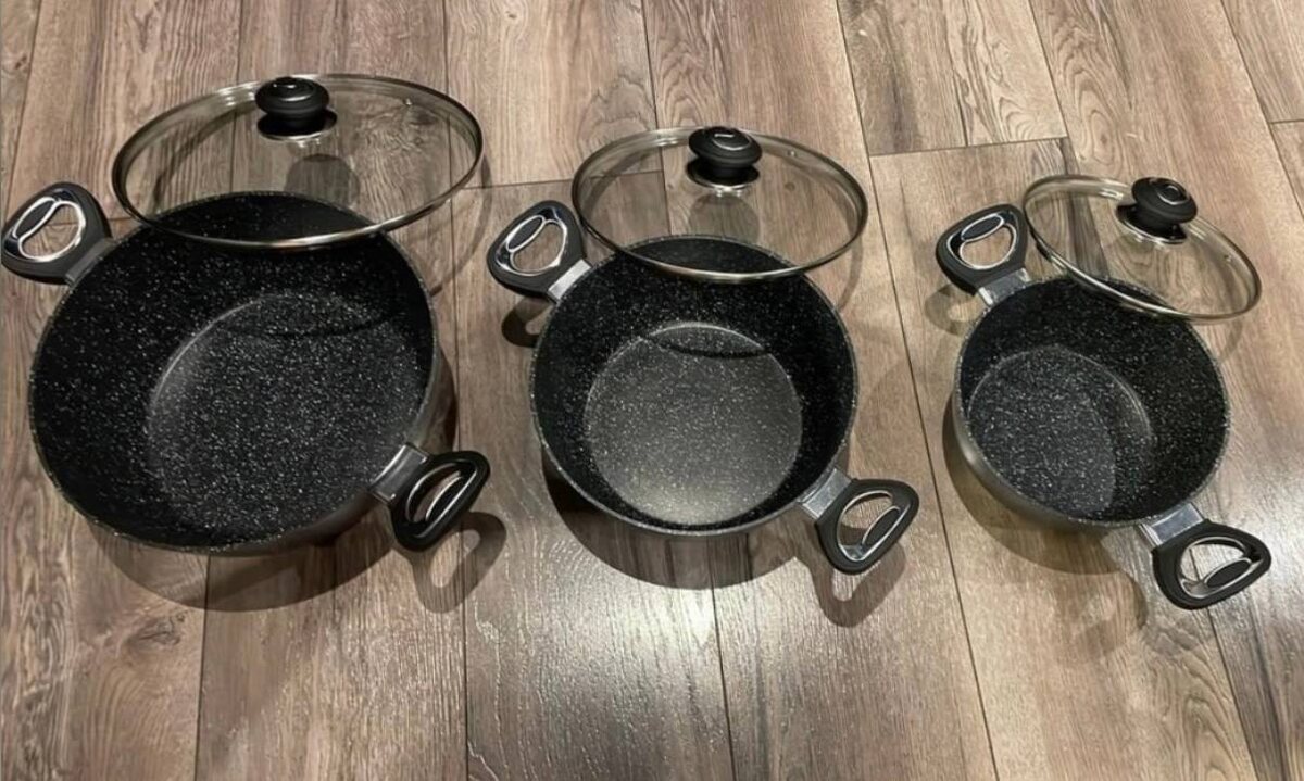Посуда с мраморным антипригарным покрытием, из литого алюминия. Ручки из бакелита с силиконовым напылением не нагреваются, что очень удобно. В комплектацию входят 3 кастрюли с крышками, ковш с крышкой, две сковороды на 24 и 28 сантиметров.