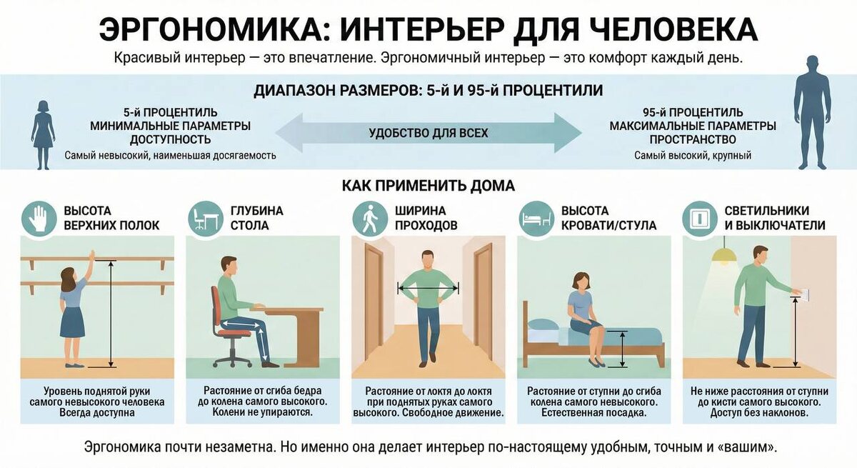 Красивый интерьер — это впечатление. Эргономичный интерьер — это комфорт каждый день. Эргономика изучает, как пространство взаимодействует с телом человека: его ростом, движением, привычками. Чтобы интерьер был удобен всем, используют диапазон размеров — 5-й и 95-й процентили. 🔎 5 процентиль — минимальные параметры (самый невысокий, наименьшая досягаемость). Применяется там, где важна доступность. 🔎 95 процентиль — максимальные параметры (самый высокий, крупный). Используется там, где нужно достаточно пространства. Иначе говоря, интерьер должен быть удобен и самому миниатюрному, и самому высокому человеку в семье. Как применить это дома 👇 🖐 Высота верхних полок Самая высокая полка — на уровне поднятой руки самого невысокого члена семьи. Тогда ею будут пользоваться, а не избегать. 🪑 Глубина стола Не меньше расстояния от сгиба бедра до колена самого высокого члена семьи — чтобы колени не упирались в стену или тумбу. 🚶 Ширина проходов Ориентир — расстояние от локтя до локтя