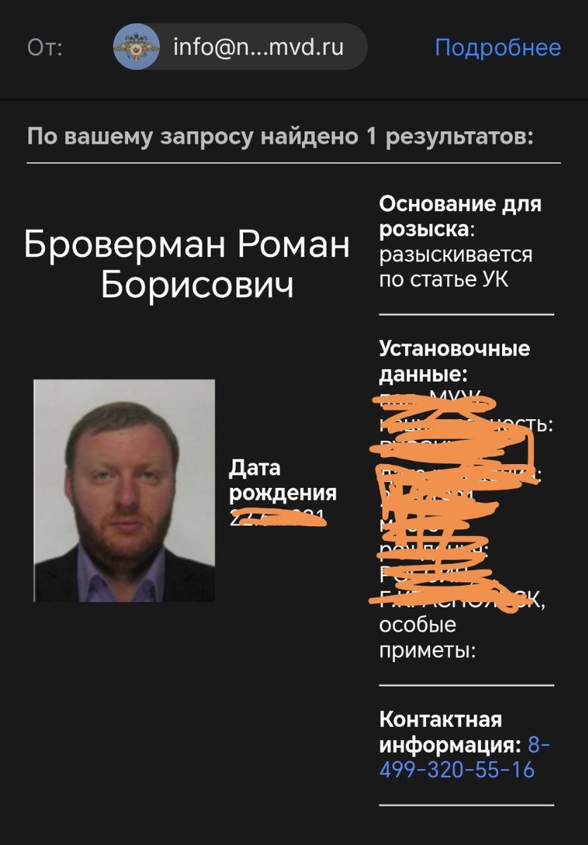 ! Разыскивается органами МВД экс-топменеджер ГК "Орион телеком" и экс-руководитель УК "ЖСК" Броверман Роман Борисович. В настоящее время Броверман Р.Б. является руководителем трех организаций: ООО УК "Перспектива" ООО ГУК "Единство" ООО "Открытие" Напомним: Броверман Р. Б. также Руководил УК где произошло ЧП с пожаром на автомобильной парковке в доме на ул. Бограда. Источники сообщают, что ведется активная деятельность по продаже активов Бровермана в Красноярске (информацию проверяем). Броверман разыскивается по УГОЛОВНОЙ СТАТЬЕ! В случае наличия у Вас информации о нахождении разыскиваемого гражданина, просим незамедлительно сообщить к нам в редакцию и органы МВД. __ 🔴Оставить обращение ✏️ 🔴Мы в MAX
