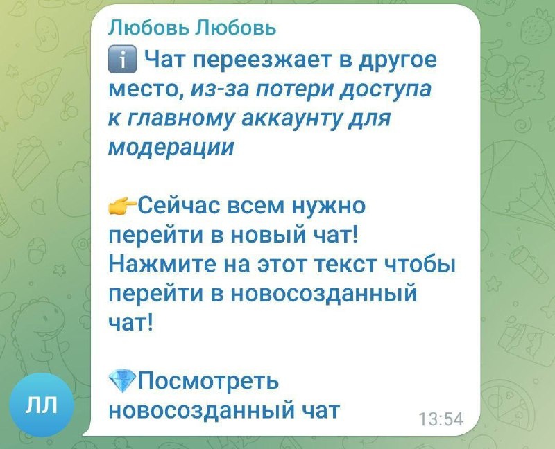 ! Друзья, обращайте внимание ВЕЗДЕ Сейчас активно в Телеграм появились в чатах вот такие сообщения. Ни в коем случае не переходим! ❗️❗️❗️В данном случае запускается бот, который запрашивает ваши данные от ТГ для «перехода в новый чат», а по факту угоняет аккаунт с полным доступом к нему ❗️❗️❗️ И рассылает такие же сообщения АВТОМАТОМ во ВСЕ ЧАТЫ, в которых вы состоите Будьте бдительны, пожалуйста! Передайте эту информацию своим партнерам! ❗️❗️❗️ Чтобы как можно меньше людей в будущем повелись на этот развод 🙏🏻