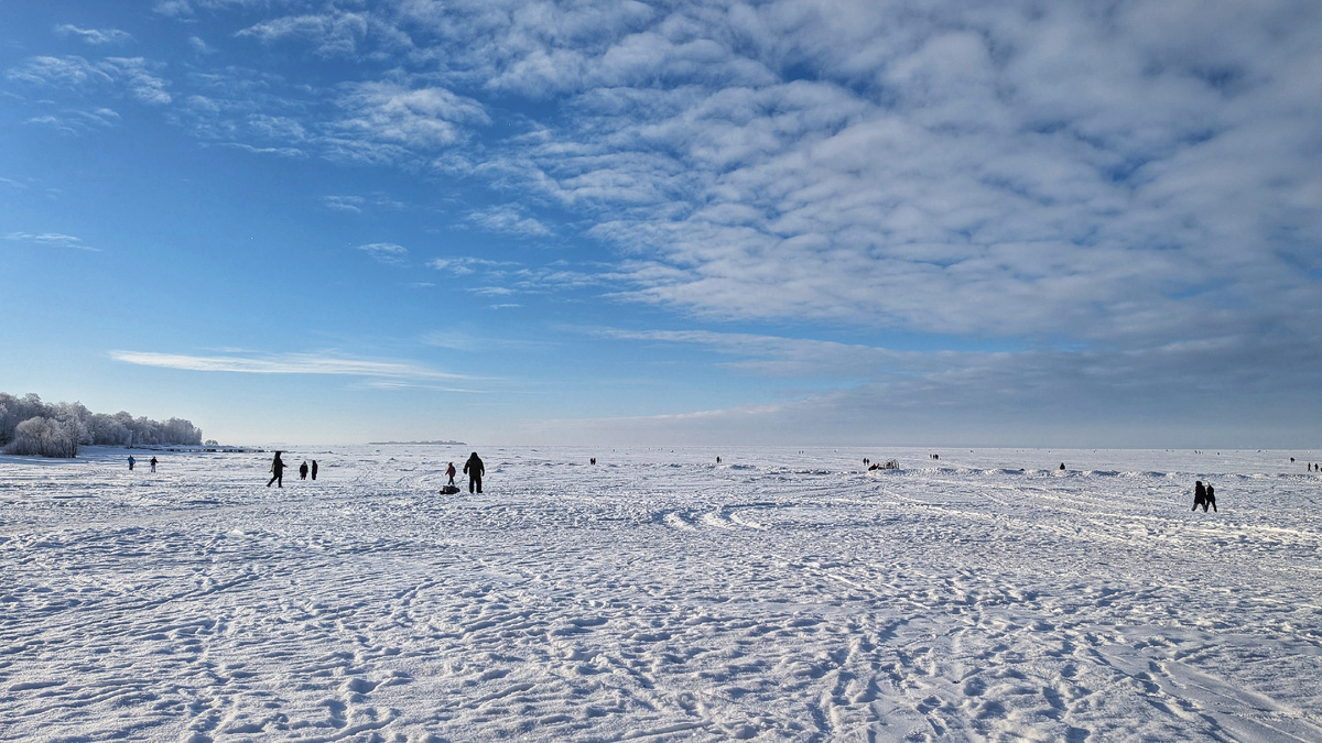 Кругом - сплошная белизна. Белый снег покрывает лед залива и блестит на ярком солнце. Несмотря на холод, на льду полно народа. Кто-то рыбачит, кто-то катается на лыжах, кто-то просто гуляет.