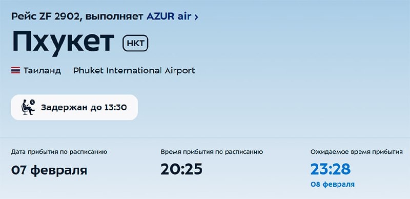 Так, ZF-2902 в Москву сдвинули еще на 4 часа, на данный момент задержка превышает уже сутки. Во Внуково лайнер ждут к полуночи. Еще одну ночь придется провести на таиландском острове туристам из Владивостока: ZF-2994 должен был вылететь сегодня в 18:30, но его отложили до 09:10 понедельника. А ZF-2947 из Новосибирска перенесли на 14,5 часа. Подробнее написали на ТурДоме. @tourdom